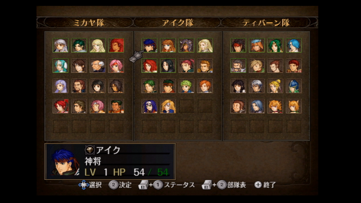第4部での部隊編成はこんな感じに。できるだけ近しい人を寄せつつ、アイク部隊は頼れるアイクがいるので少なめにしました。