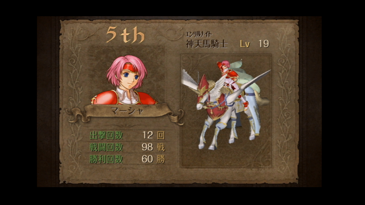 前作で仲間にできなかったユニット。高い移動力と高いステータスから仲間になると非常に頼もしく、弓が弱点じゃないということで他のペガサス部隊が苦手な弓兵の対処にも活躍してくれました。