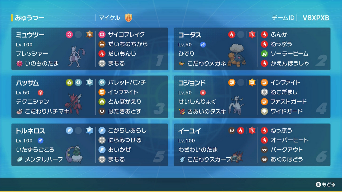 考えてる最中、「あれ、これ地面テラバースト黒バドでいいのでは?」と脳裏を過ったものの、火力で微妙にミュウツーが勝っているということで差別化にしました。
