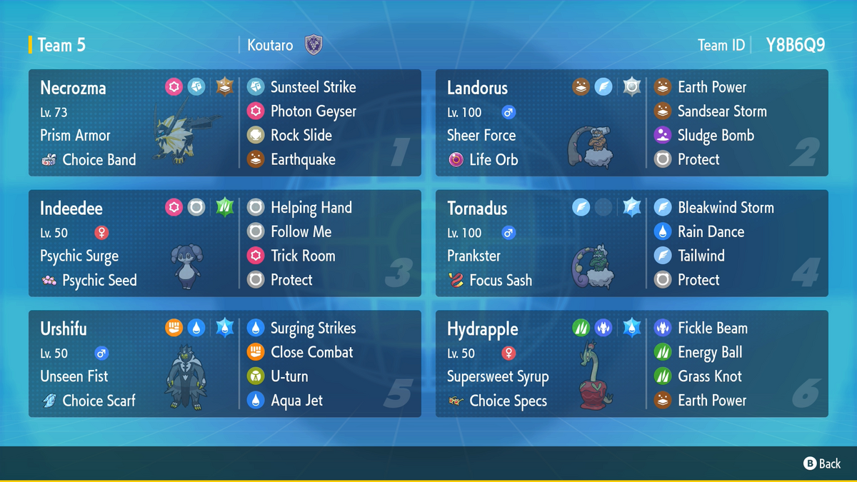 ・ネクロズマ+イエッサンの並びだと相手のタスキ持ちの処理が遅れるのが弱点。タスキ持ちはできれば連撃ウーラオスで倒したい。