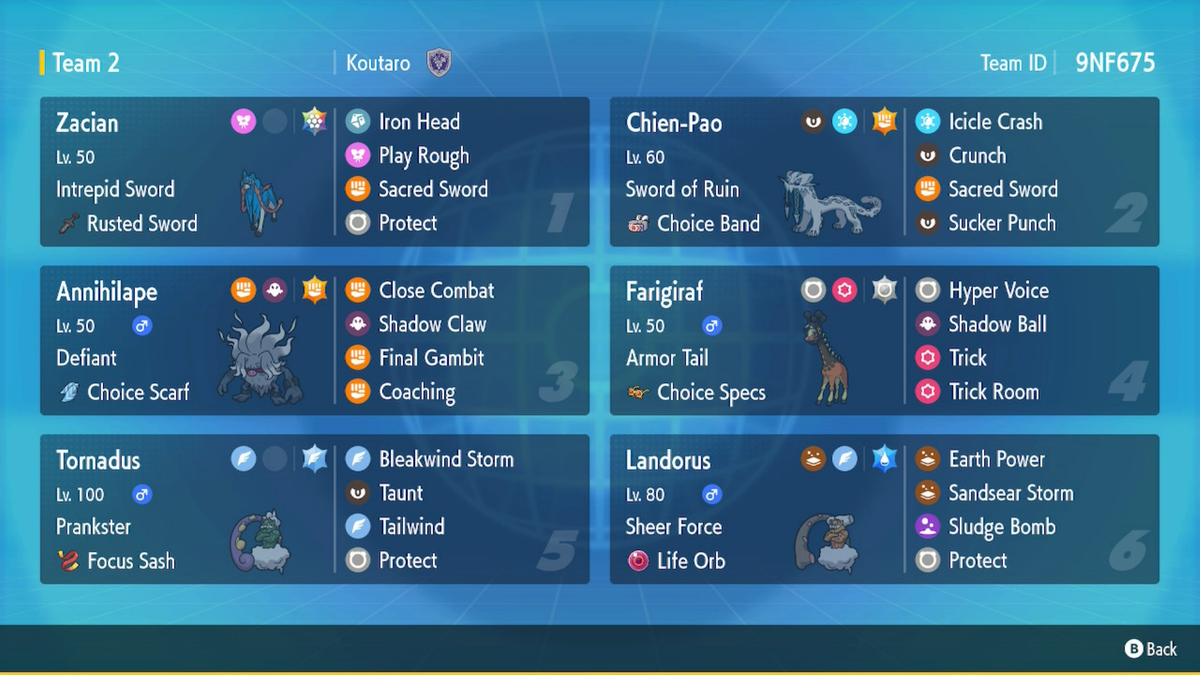 それとは別にパオジアンもザシアンと相性が良さそうなのでぜひ入れたい。これでトルネロス、レジドラゴ、ザシアン、パオジアンが決まり。