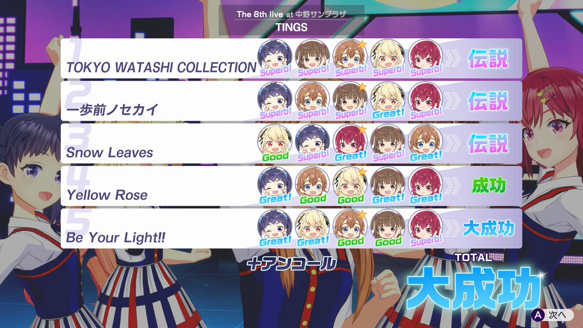 今までペンライトは、ただ単に好調を表すものだと思っていました。が、どうやらその曲で一番評価が高いアイドルに出るものである模様。例えば↓のTOKYO WATASHI COLLECTIONはペンライトが0でした。なぜなら全員がSuperb!だったから。全員が同じ評価だったときはペンライトは出ないようです。
