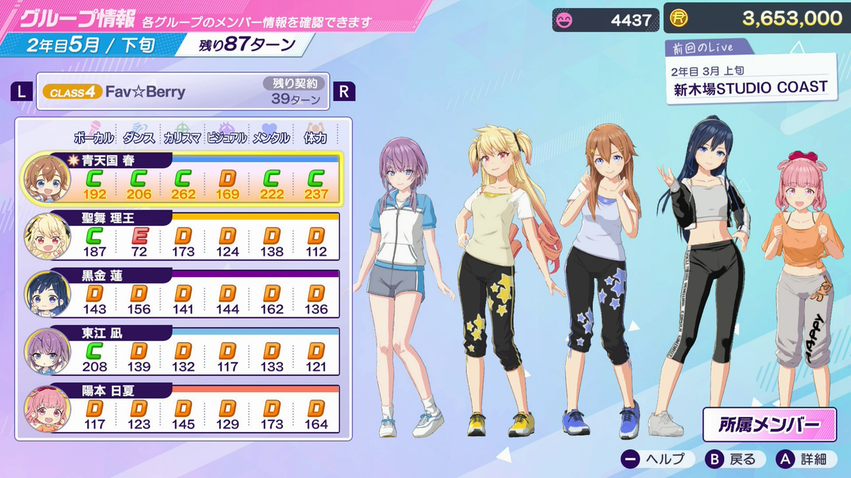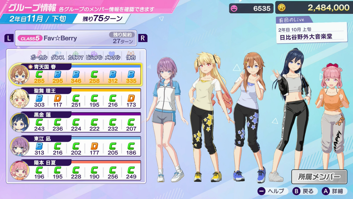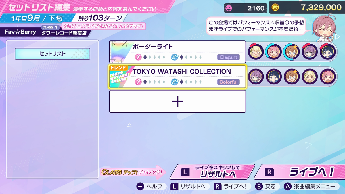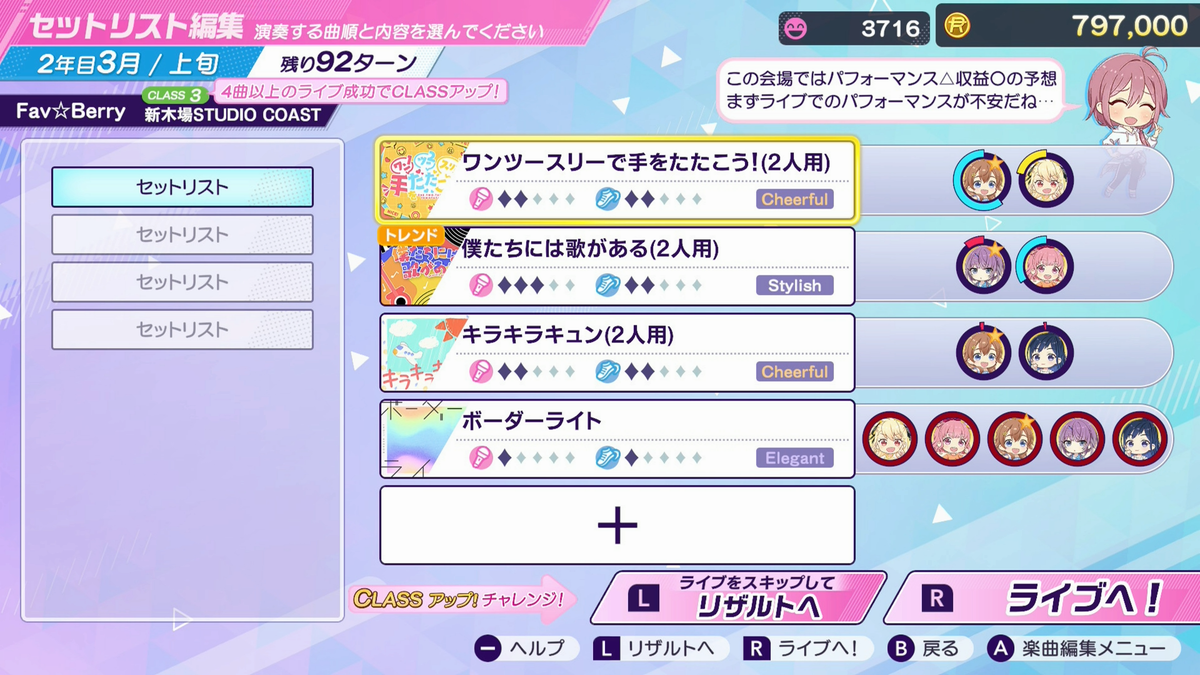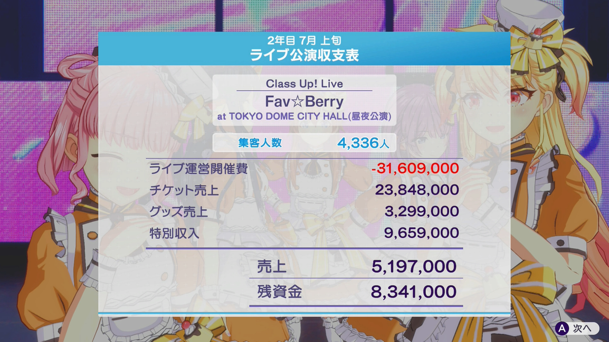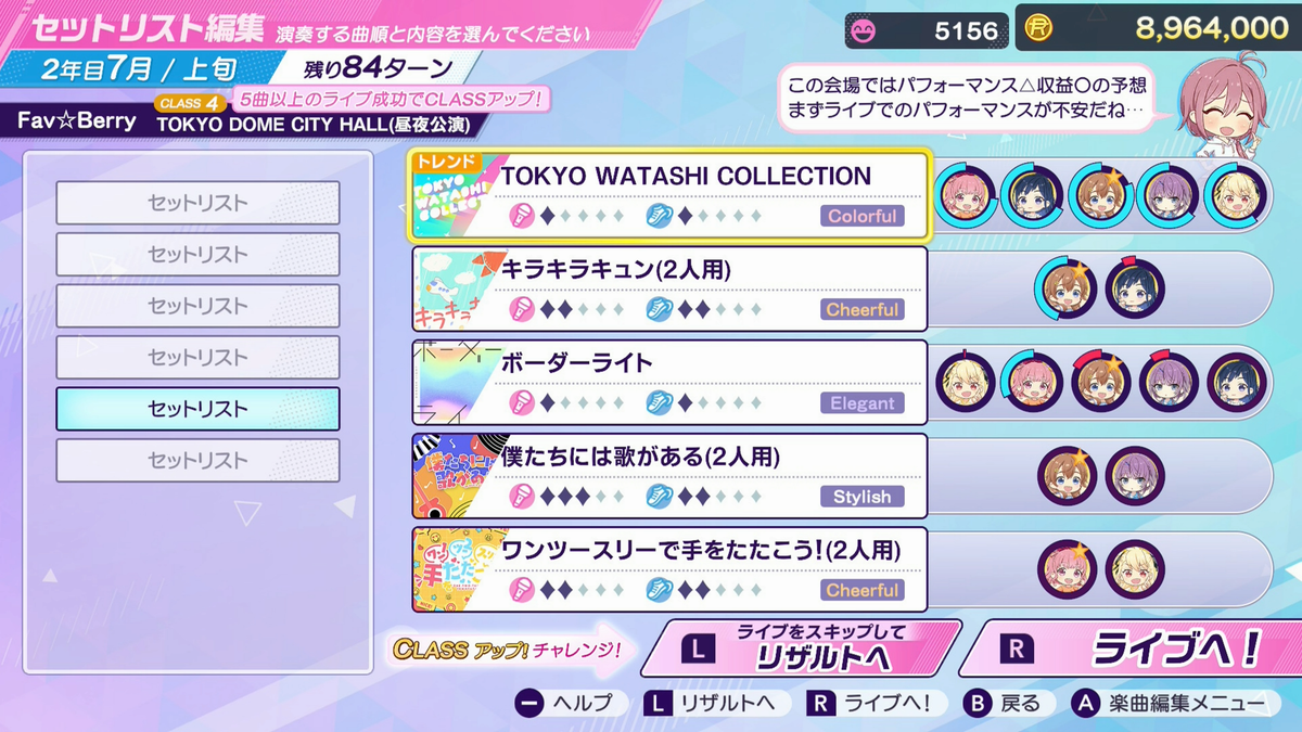 難関である2年目7月上旬のTOKYO DOME CITY HALLライブ。覚醒春がいてもパフォーマンスは△。結果なんとか成功。体力の多い覚醒春がいたおかげで低難易度の5人曲を2曲入れれたのが大きい。とはいえ会場も埋まりはしなかったこともあり、このルートはリスクのわりにあまり割に合わないクラスアップルートではあると思う。