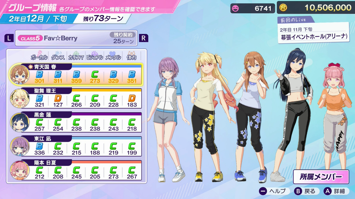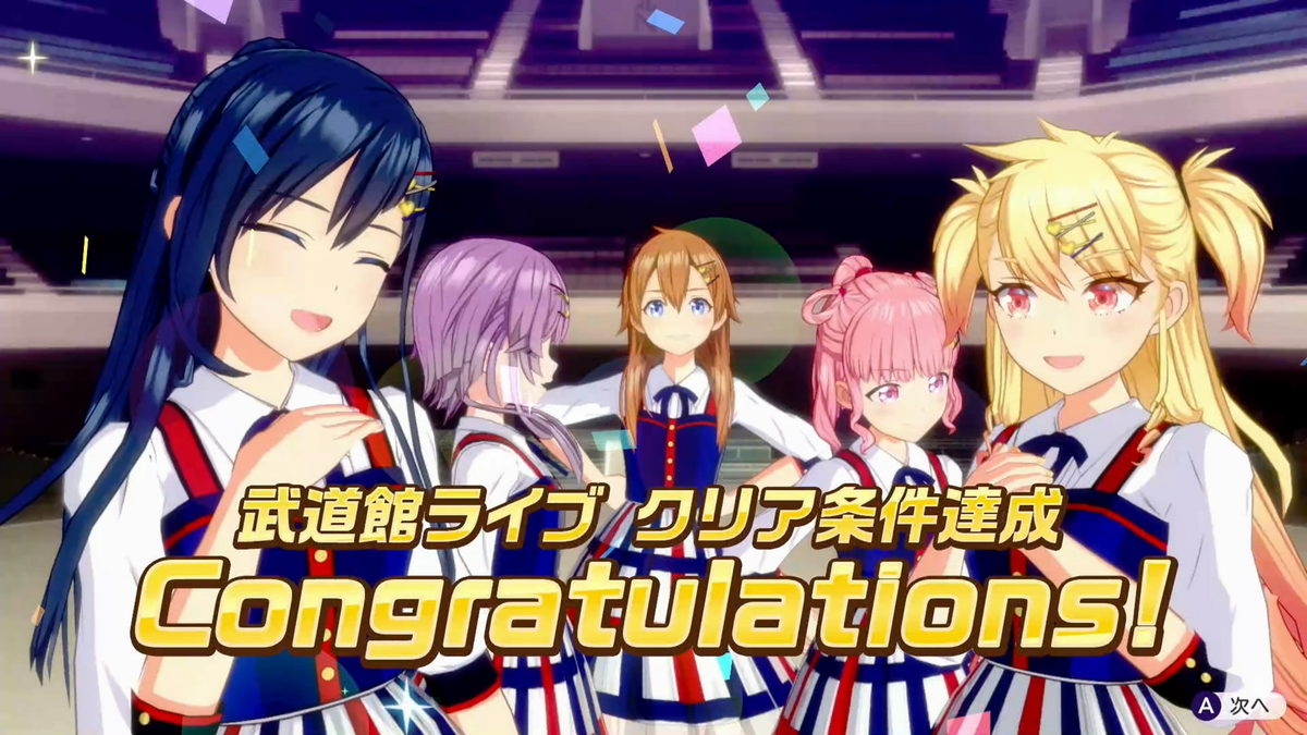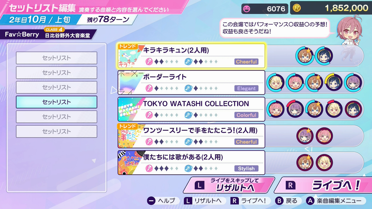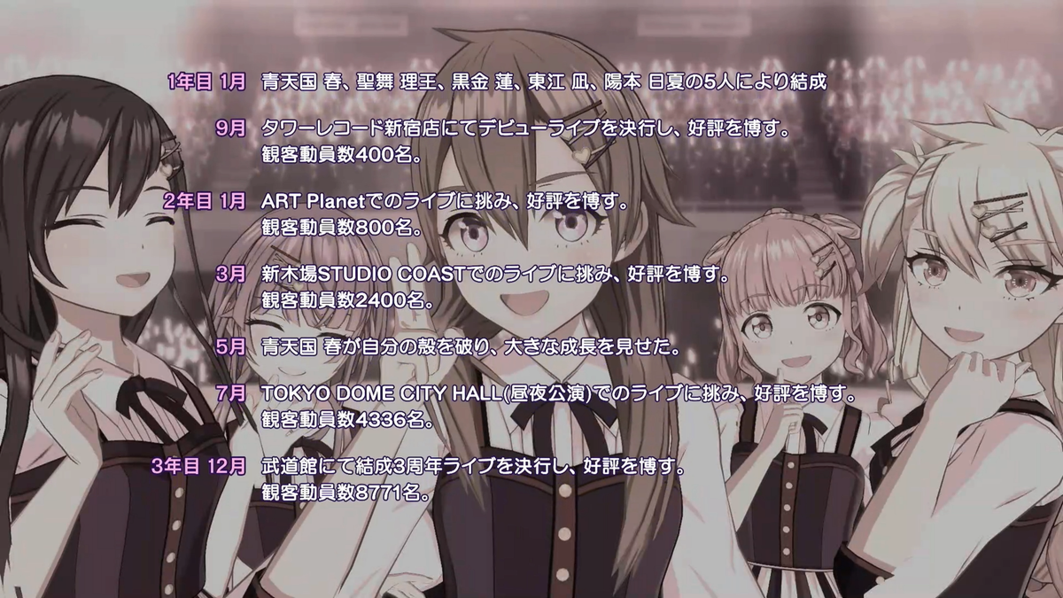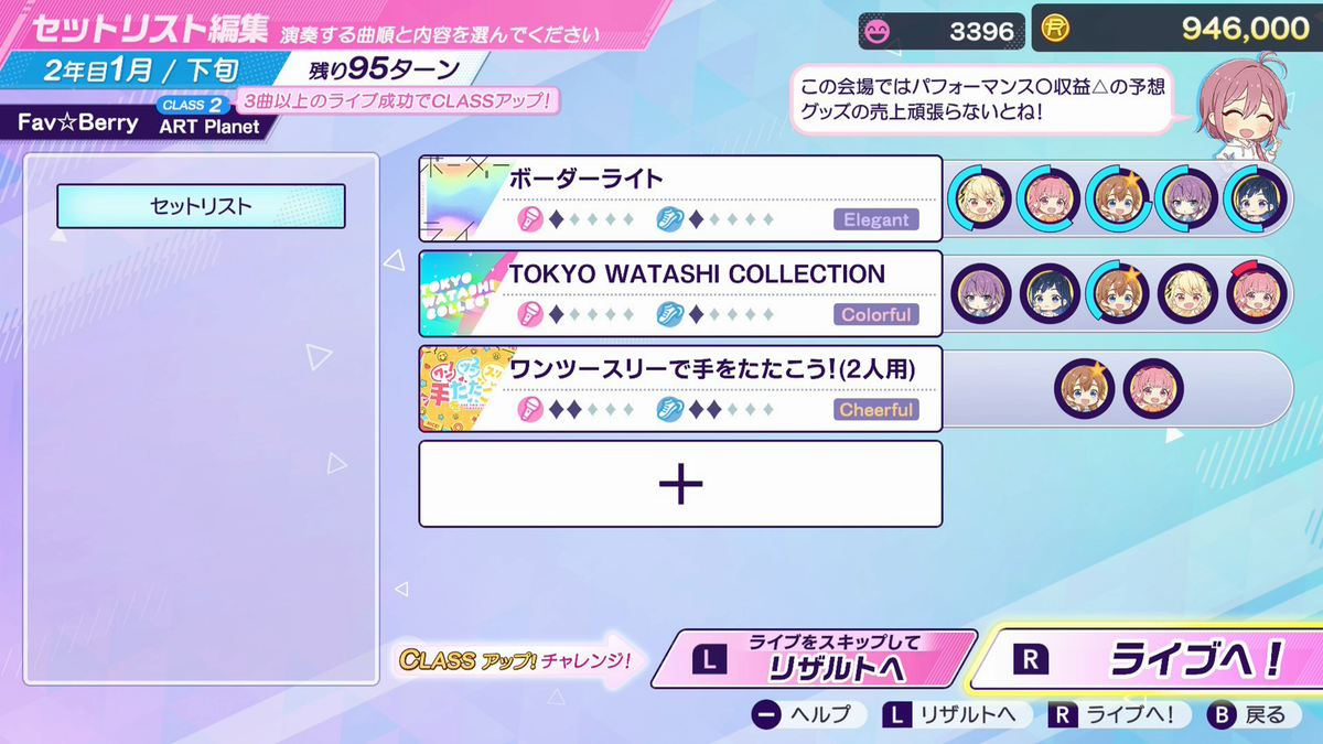 難関である2年目7月上旬のTOKYO DOME CITY HALLライブ。覚醒春がいてもパフォーマンスは△。結果なんとか成功。体力の多い覚醒春がいたおかげで低難易度の5人曲を2曲入れれたのが大きい。とはいえ会場も埋まりはしなかったこともあり、このルートはリスクのわりにあまり割に合わないクラスアップルートではあると思う。