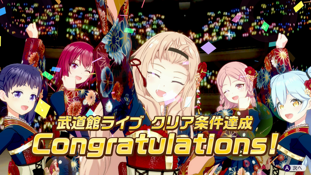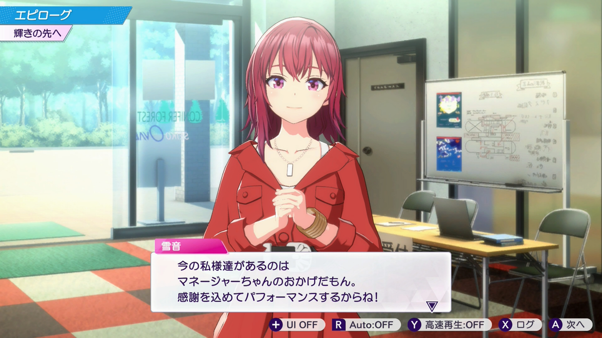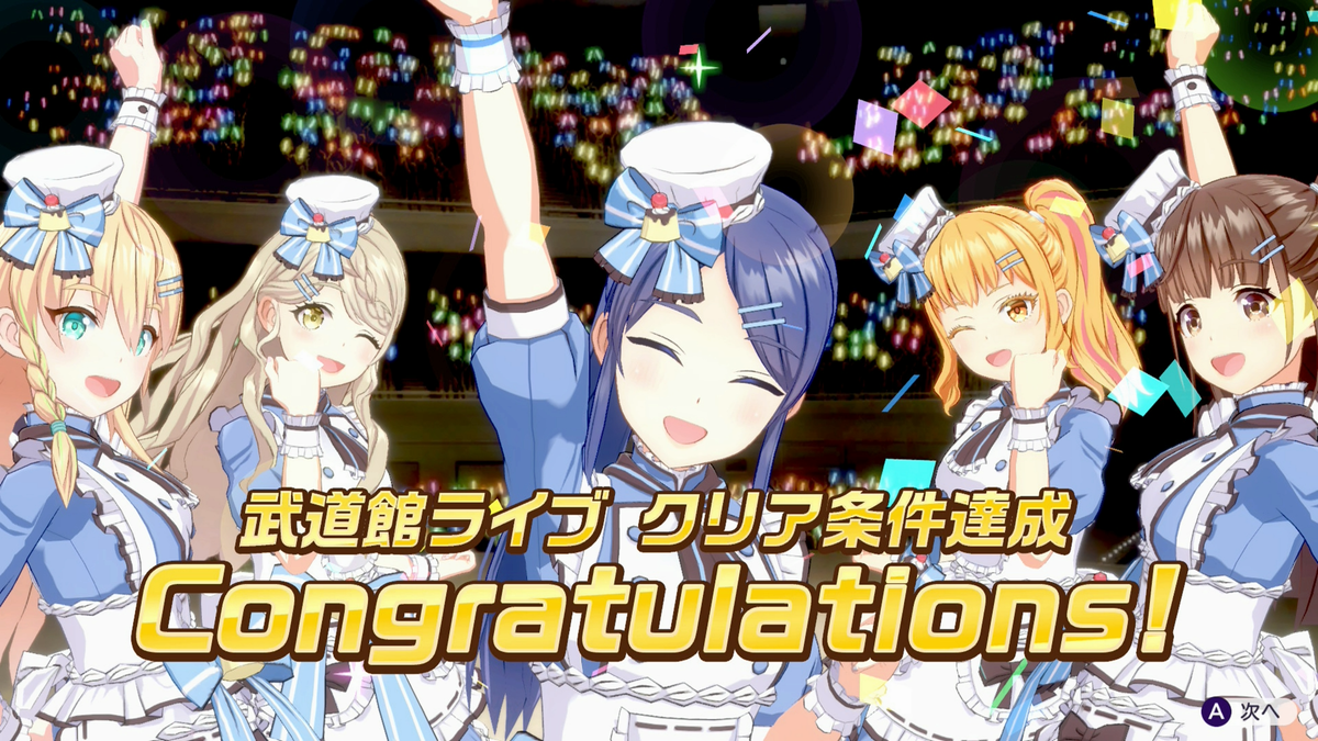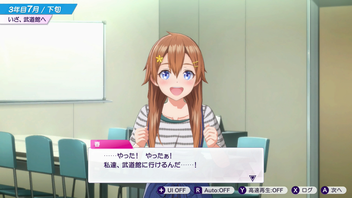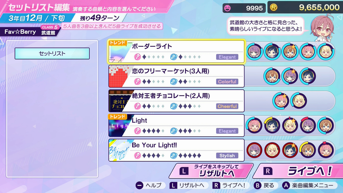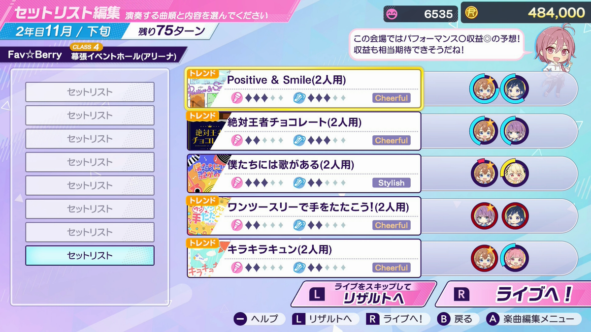 難関である2年目7月上旬のTOKYO DOME CITY HALLライブ。覚醒春がいてもパフォーマンスは△。結果なんとか成功。体力の多い覚醒春がいたおかげで低難易度の5人曲を2曲入れれたのが大きい。とはいえ会場も埋まりはしなかったこともあり、このルートはリスクのわりにあまり割に合わないクラスアップルートではあると思う。