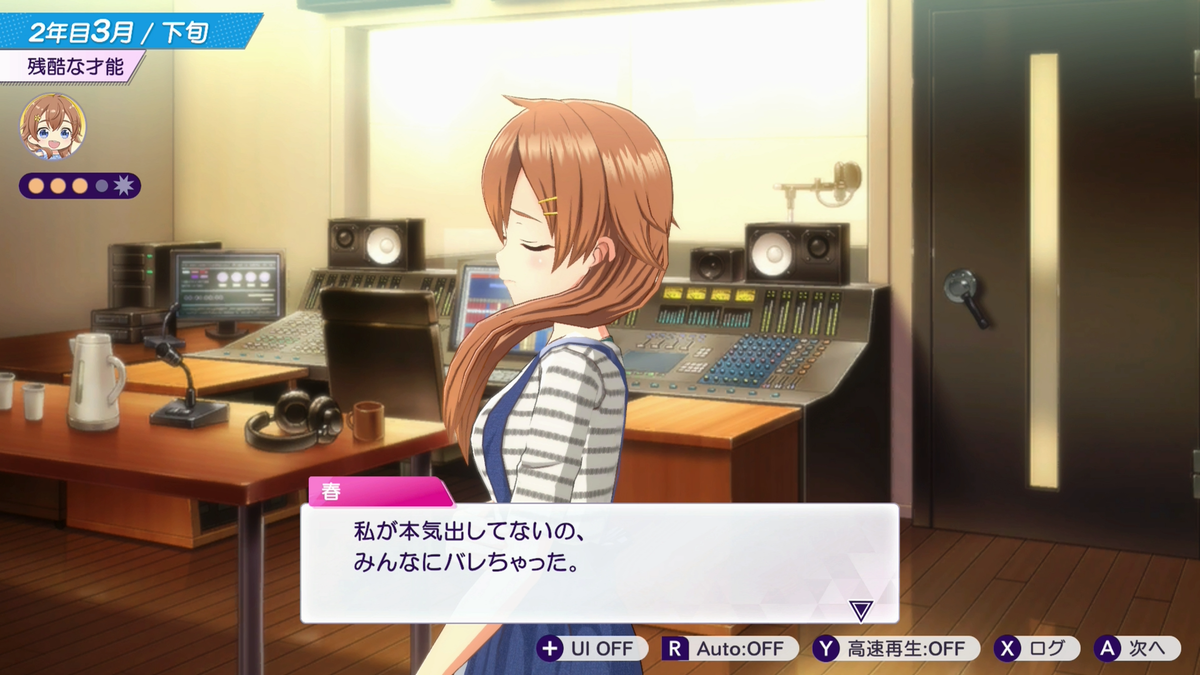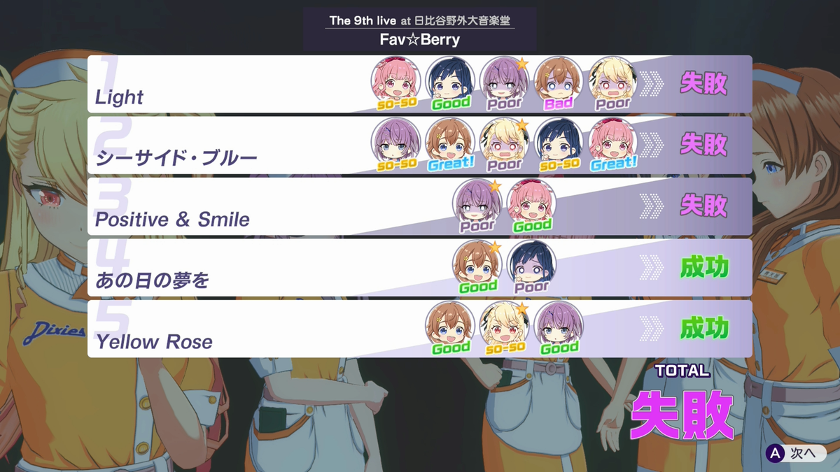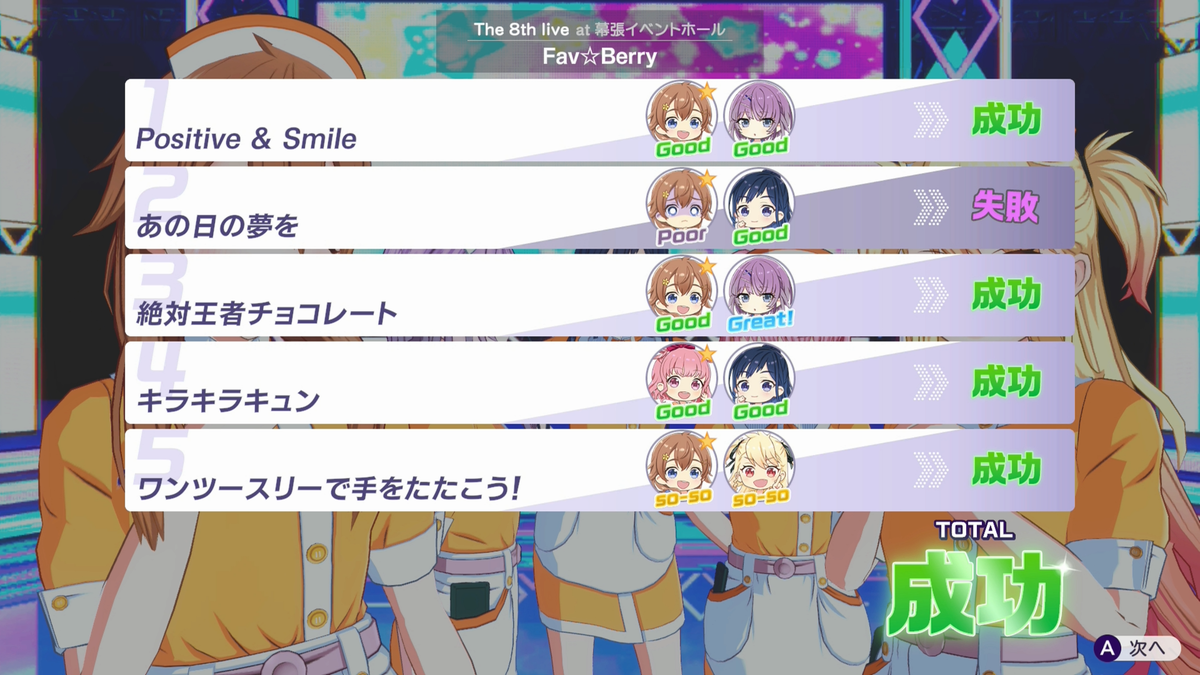 小夢さんの評価は◯。春日夏の体力コンビのおかげで前回購入した1-1の曲も使いながら3曲ライブができる。無事に成功。