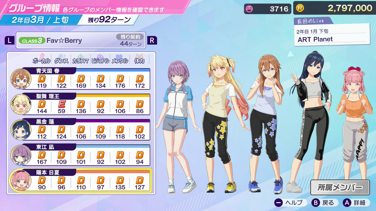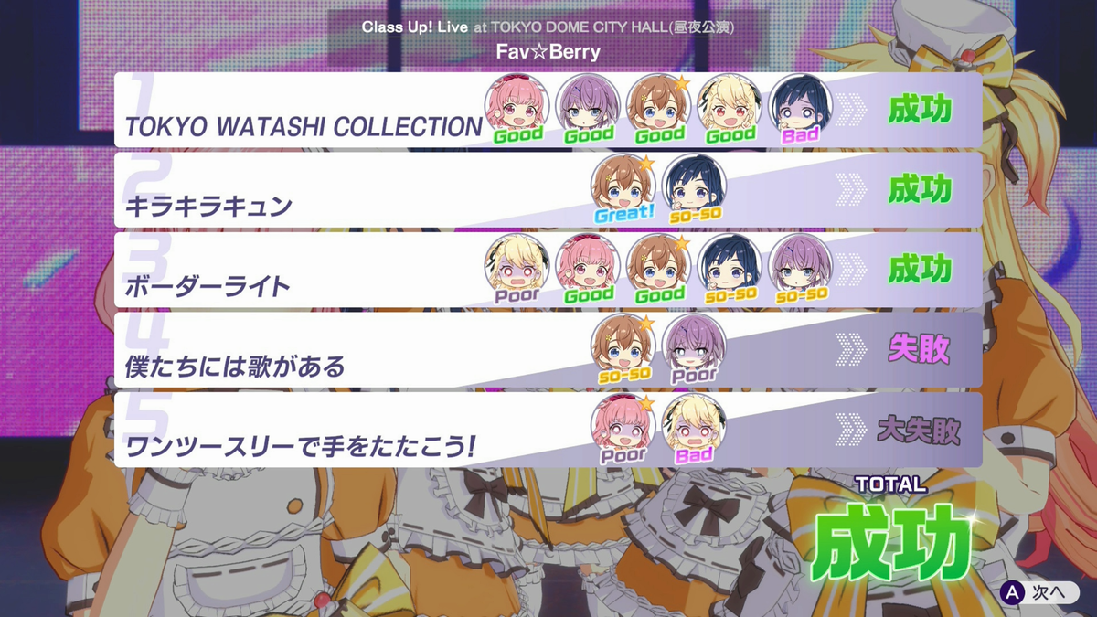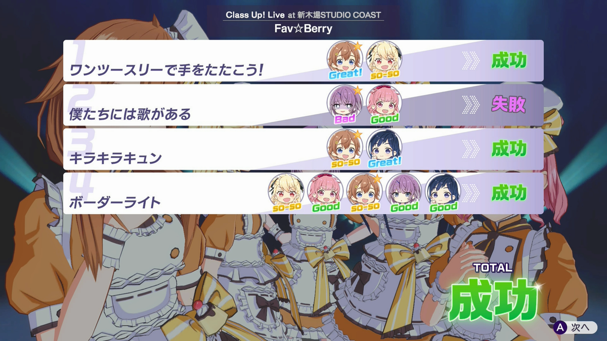 メンバーに春がいて、かつ春が主力ならこの早期クラスアッププランで行こうと3月にクラスアップライブに挑戦。小夢さん評価は△ながら成功。