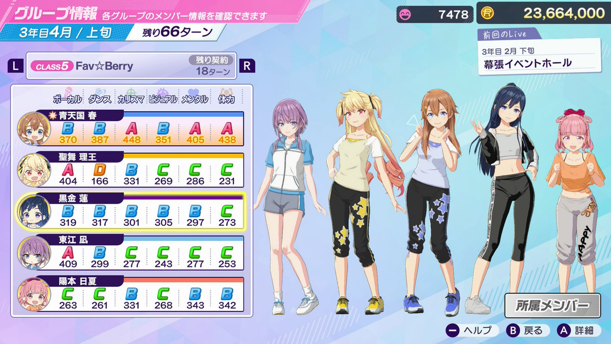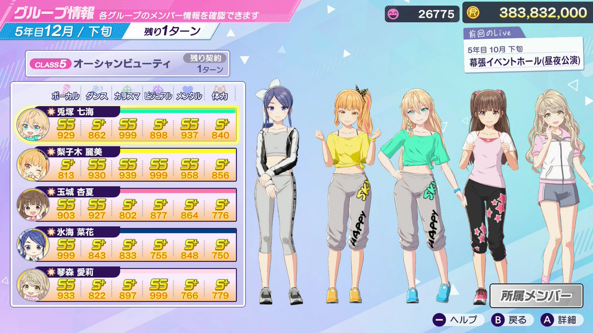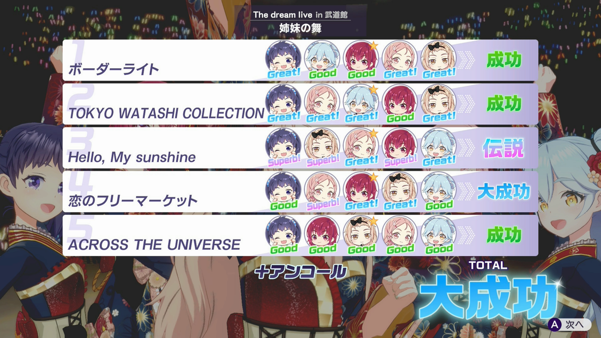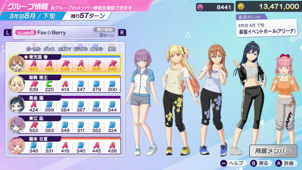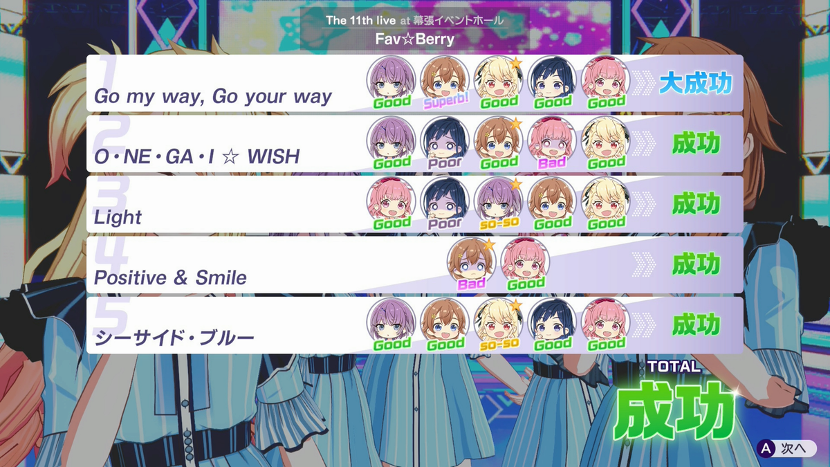 何気に春を1期生エースにしたのが初めてか超久しぶりだったので(伝説狙いで3期生に回していた期間が長かった)、絶対に上手くやりたい時の1期生の覚醒春はこんなに頼もしいのかと驚きました。中盤は圧倒的ながら、最終的には他のメンバーも追いついて、春が失敗した時に他のメンバーが成功してカバーするようなところが見られるバランスになっているのもこのゲームのいいところだなと思いました。