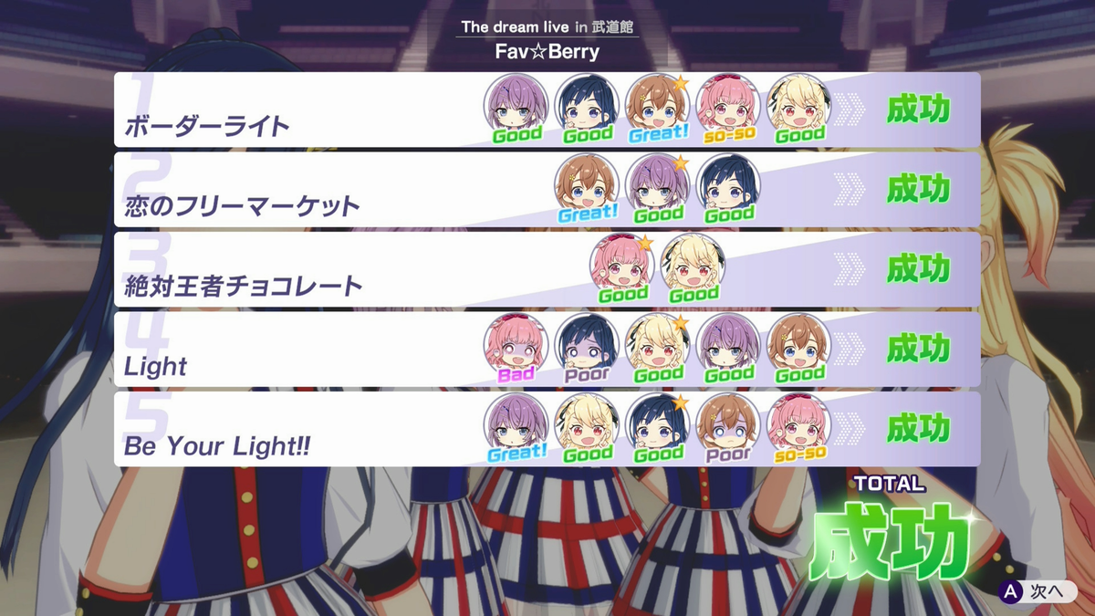 最初の低難度曲でSuperb!を出して総合大成功にならないかなと期待しつつ、お気に入りの中難度曲を入れつつ、グループの完成度をアピールする高難度曲で締めるというセットリスト。公平に全員がセンター。蓮がBe Your Light!!のセンターをやるというのが熱い。