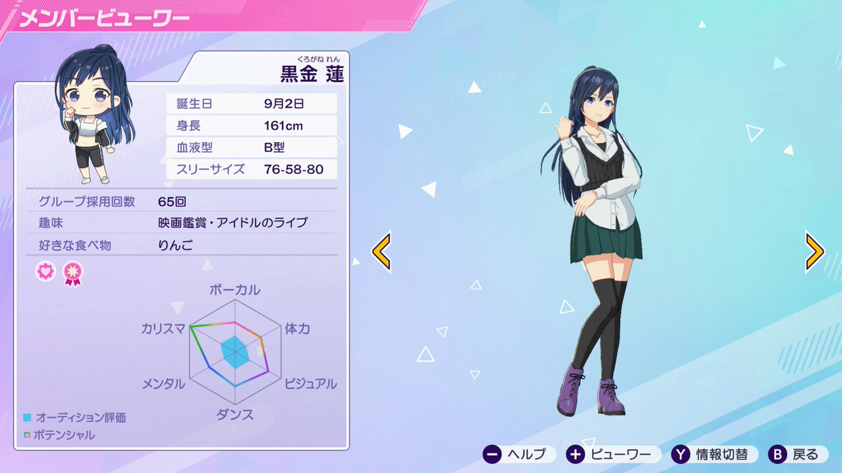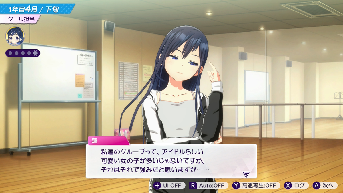 ・武道館をより多くの人数で満たしたいと考えたりスポンサーがいたこともあって経営も伸ばそうとしたものの、失敗が挟まって経営2回+政治力Dまでで経営がEにならなかった。運が悪かったとも取れるし、1期生注力の場合はやっぱり経営にターンを割いたこと自体間違いという説もある。