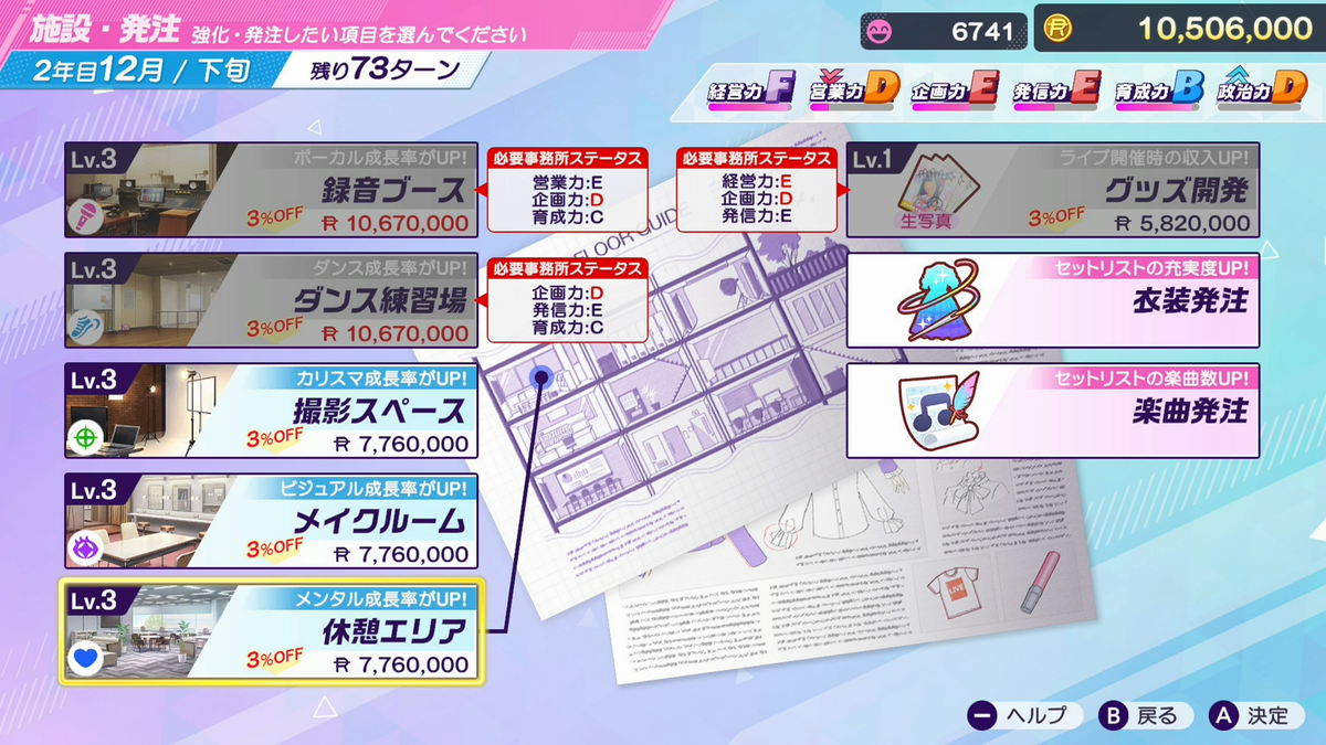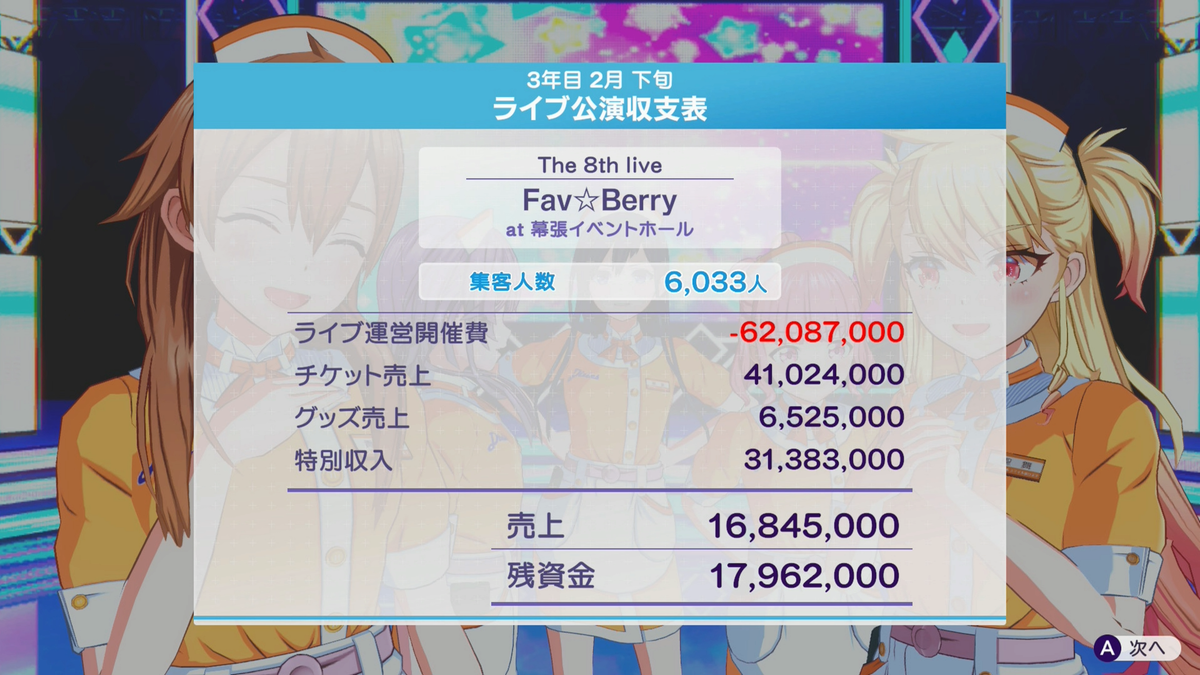 アイドルの育成に注力すると事務所が育たず(ファンが増えず)、事務所運営に注力するとアイドルが育ち遅れるという問題に挟まれる難関3年目2月下旬幕張ライブ。ここの売上を引き上げるには両者のバランスをどう取るべきか...。